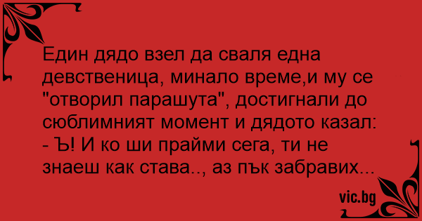Един дядо взел да сваля една девственица, минало време,и му се "отворил парашута", достигнали до сюблимният момент и дядото казал:
