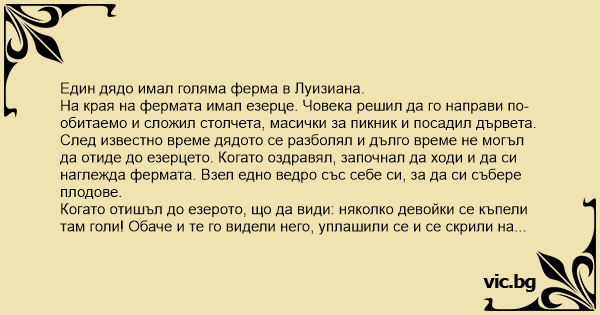 Нa края на фермата имал езерце. Човека решил да го направи по-обитаемо и сложил столчета, масички за пикник и посадил дървета.