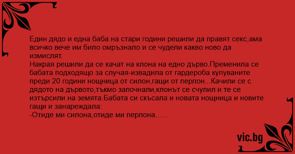 Един дядо и една баба на стари години решили да правят cekc,ама всичко вече им било омръзнало и се чудели какво ново да измислят.