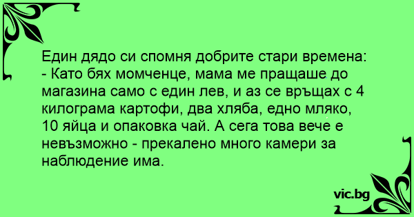 - Като бях момченце, мама ме пращаше до магазина само с един лев, и аз се връщах с 4 килограма картофи, два хляба, едно мляко, 10 яйца и опаковка чай. А сега това вече е невъзможно - прекалено много камери за наблюдение има.