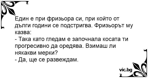 Един е при фризьора си, при който от дълги години се подстригва. Фризьорът му казва: