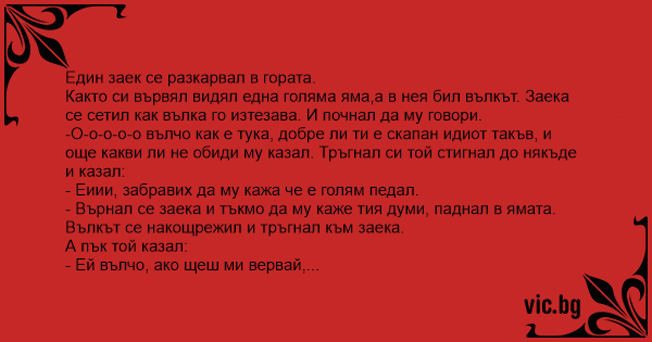 -О-о-о-о-о вълчо как е тука, добре ли ти е скапан идиot такъв, и още какви ли не обиди му казал. Тръгнал си той стигнал до някъде и казал: