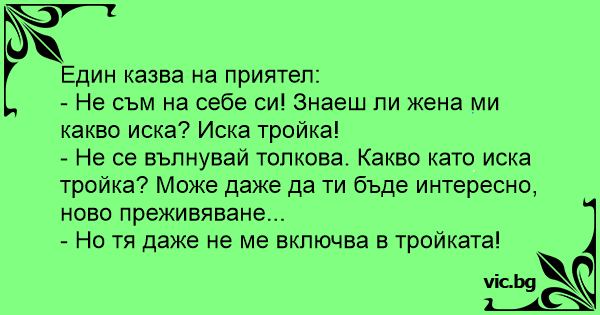 - Не съм на себе си! Знаеш ли жена ми какво иска? Иска тройка!
