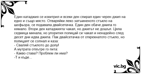 Един катаджия се изхитрил и всеки ден спирал един черен джип на едно и също място. Отваряйки леко затъмненото стъкло на шофьора, се подавала двайсетачка. Един ден обаче джипа го нямало. Втори ден катаджията чакал, но джипът не дошъл. Цяла седмица минала, но упорития полицай си чакал и ненадейно след десет дни идва джипа. Пак двайсетачка от открехнатото стъкло, но полицаят се сопнал и каза: