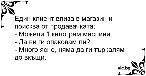Влиза човек в магазина: - Може ли един килограм маслини- Добре. Im Einkaufsladen: Möchten Sie eine Tüte haben Nein, ich möchte die Einkäufe auf meinem Kopf nach Hause balancieren.