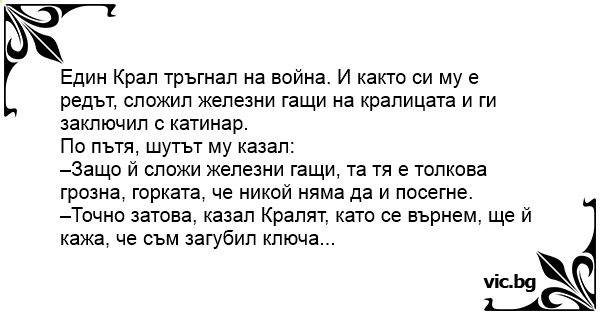 Един Крал тръгнал на война. И както си му е редът, сложил железни гащи на кралицата и ги заключил с катинар.