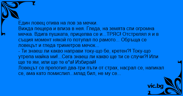 Вижда пещера и влиза в нея. Гледа, на земята спи огромна мечка. Вдига пушката, прицелва се и...ТРЯС! Отстрелял я и в същия момент някой го потупал по рамото... Обръща се ловецът и гледа триметров мечок...