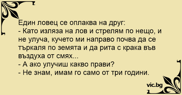 - Като изляза на лов и стрелям по нещо, и не улуча, кучето ми направо почва да се търкаля по земята и да рита с крака във въздуха от смях...