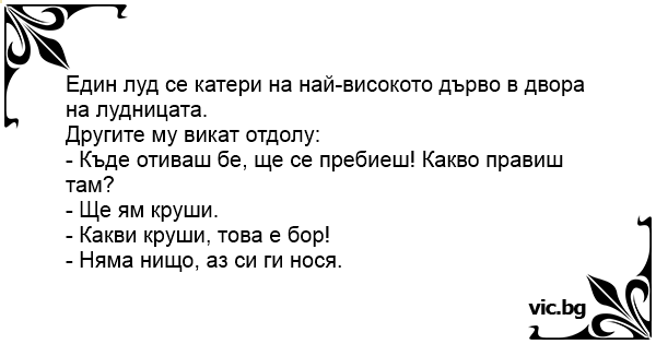 Една крава се покатерила на едно дърво. Минал един един червей и я пита: