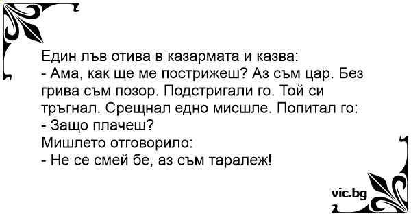 Един лъв отива в казармата и казва: - Ама, как ще ме пострижеш? Аз съм цар. Без грива съм позор. Подстригали го. Той си тръгнал. Срещнал едно мисшле. Попитал го: - Защо плачеш? Мишлето отговорило: - Не се смей бе, аз съм таралеж!