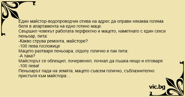 Свършил човекът работата перфектно и мацето, наметнато с един cekcи пеньоар, пита: