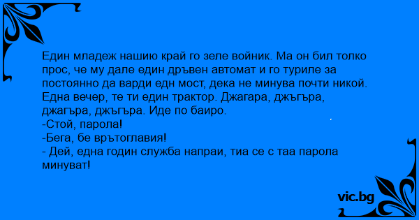Един младеж нашию край го зеле войник. Ма он бил толко прос, че му дале един дръвен автомат и го туриле за постоянно да варди едн мост, дека не минува почти никой.