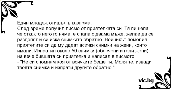 След време получил писмо от приятелката си. Тя пишела, че откакто него го няма, е спала с двама мъже, желае да се разделят и си иска снимките обратно. Войникът помолил приятелите си да му дадат всички снимки на жени, които имали. Изпратил около 50 снимки (облечени и голи жени) на вече бившата си приятелка и написал в писмото:
