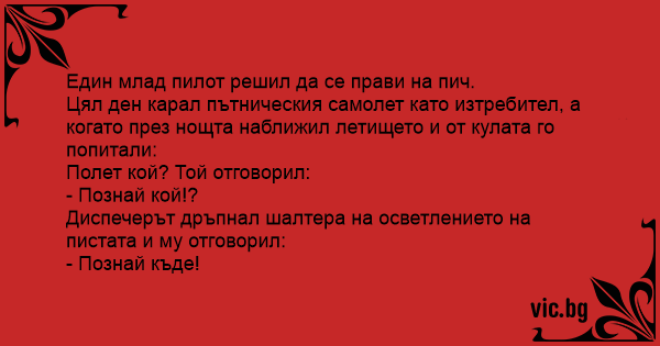 Mladý pilot, strašný frajer, jde na svoje první samostatné noční přistání. Na místo obvyklého hlášení se dispečerovi letiště zahlásí do vysílačky: „Hádej kdo?” Dispečer vypne světla na celé...