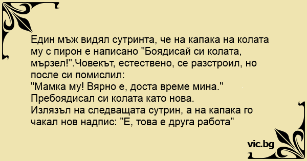 Един мъж видял сутринта, че на капака на колата му с пирон е написано "Боядисай си колата, мързел!".Човекът, естествено, се разстроил, но после си помислил: