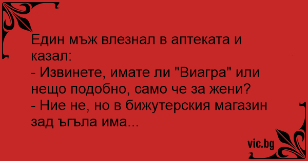 Маж влегува во аптека и прашува: Мужчина в аптеке: - Ало, справки? Бихте ли ми казали, къде се продава Виагра за жени? Чоловік приходить ув аптеку й запитує в провізора: — Чи маєте ви “Віагру” для жінок чи щось подібне? — Ми не маємо, але в ювелірній крамниці за рогом можна щось підібрати… — Алло, довідкова? Ви не підкажете, де продається віагра для жінок? — У будь-якій ювелірній крамниці. - Alo, biroul de informatii? Spuneti-mi, va rog, unde pot gasi Viagra pentru femei? - In orice magazin de bijuterii.