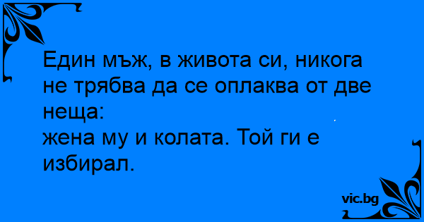 Един мъж, в живота си, никога не трябва да се оплаква от две неща:<br />жена му и колата. Той ги е избирал.