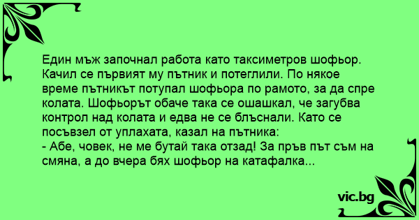 - Абе, човек, не ме бутай така отзад! За пръв път съм на смяна, а до вчера бях шофьор на катафалка...