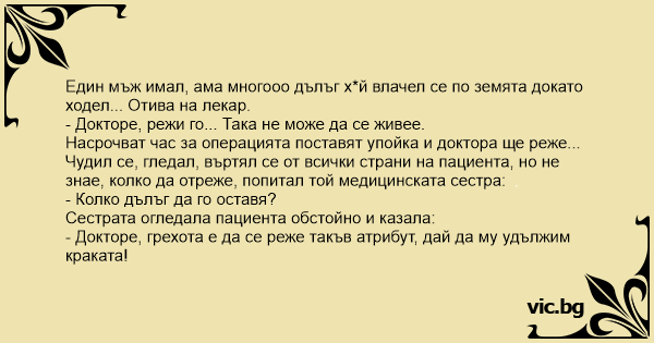 Един мъж имал, ама многооо дълъг хуй влачел се по земята докато ходел... Отива на лекар.