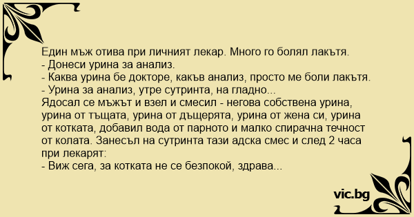 Ядосал се мъжът и взел и смесил - негова собствена урина, урина от тъщата, урина от дъщерята, урина от жена си, урина от котката, добавил вода от парното и малко спирачна течност от колата. Занесъл на сутринта тази адска смес и след 2 часа при лекарят: