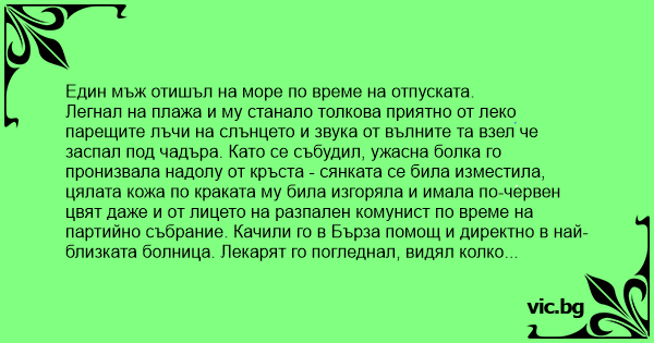 Легнал на плажа и му станало толкова приятно от леко парещите лъчи на слънцето и звука от вълните та взел че заспал под чадъра. Като се събудил, ужасна болка го пронизвала надолу от кръста - сянката се била изместила, цялата кожа по краката му била изгоряла и имала по-червен цвят даже и от лицето на разпален комунист по време на партийно събрание. Качили го в Бърза помощ и директно в най-близката болница. Лекарят го погледнал, видял колко критично е състоянието му, помислил малко и предписал рецепта която съдържала Дефламол, тоалетно мляко, цял куп лекарства и на последно място Bиaгpa. Сестрата го погледнала учудено: