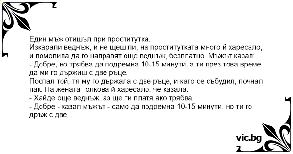 Поспал той, тя му го държала с две ръце, и като се събудил, почнал пак. На жената толкова й харесало, че казала: