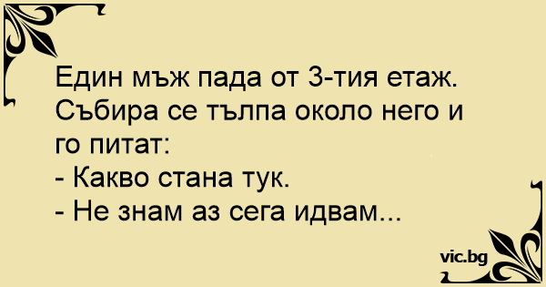 Пијаница паѓа од осми спрат, некако преживува, а насобраните луѓе околу него го прашуваат: - Што се случи?! - Не знам, само што стигнав, одговара пијаницата.