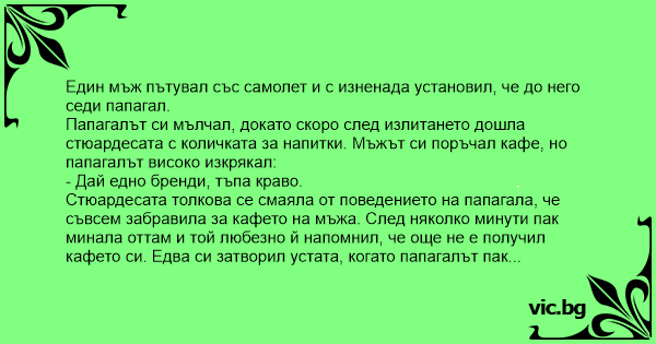 След минута смутената стюардеса се върнала с второто бренди на папагала, но отново забравила за кафето на мъжа.