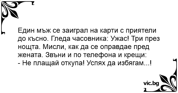 Един мъж се заиграл на карти с приятели до късно. Гледа часовника: Ужас! Три през нощта. Мисли, как да се оправдае пред жената. Звъни и по телефона и крещи:
