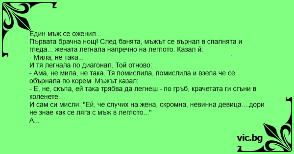 - Ама, не мила, не така. Тя помислила, помислила и взела че се обърнала по корем. Мъжът казал: