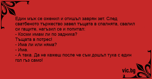 Един мъж се оженил и отишъл заврян зет. След сватбеното тържество завел тъщата в спалнята, свалил си гащите, нагъзил се и попитал: