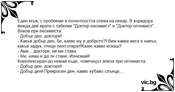Един мъж, с проблеми в потентността отива на лекар. В коридора вижда две врати с табелки "Доктор-песимист" и "Доктор-оптимист".