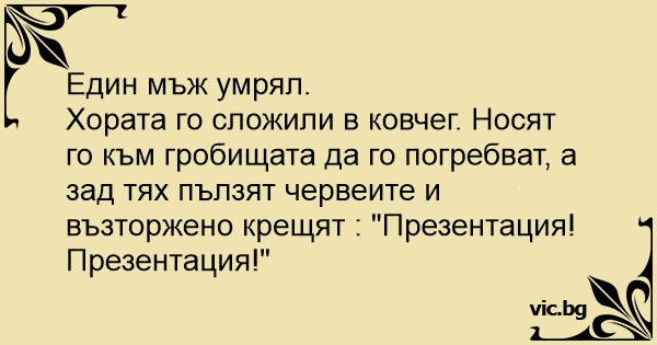 Хората го сложили в ковчег. Носят го към гробищата да го погребват, а зад тях пълзят червеите и възторжено крещят : "Презентация! Презентация!"
