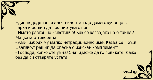 Един недодялан сваляч видял млада дама с кученце в парка и решил да пофлиртува с нея: