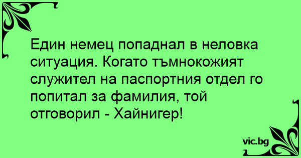 Един немец попаднал в неловка ситуация. Когато тъмнокожият служител на паспортния отдел го попитал за фамилия, той отговорил - Хайнигер!