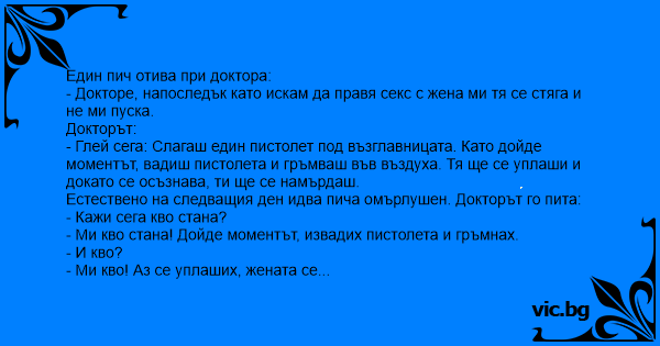 - Докторе, напоследък като искам да правя cekc с жена ми тя се стяга и не ми пуска.