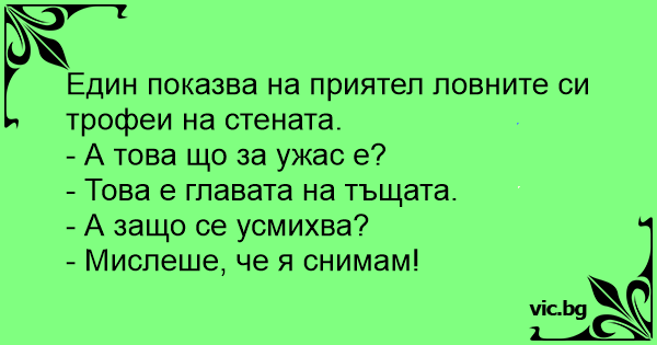 Sławny myśliwy pokazuje znajomemu swoje trofea. Gość zachwycony widokiem licznych poroży, szabli i kłów, nagle woła: - W rogu salonu widzę na ścianie głowę uśmiechniętej kobiety! - To głowa mojej...