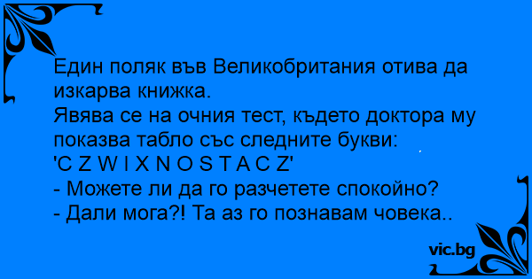 A Polish man goes to the eye doctor... A Polish man goes to the eye doctor. The bottom line of the eye chart has the letters: C z y n q s t a s z The Optometrist asks „Can you read this?” „Read...