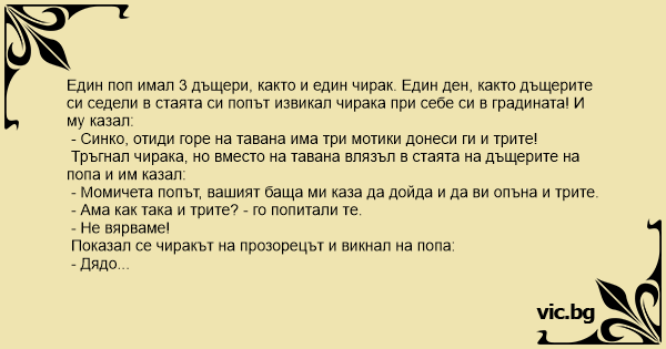 - Момичета попът, вашият баща ми каза да дойда и да ви опъна и трите.
