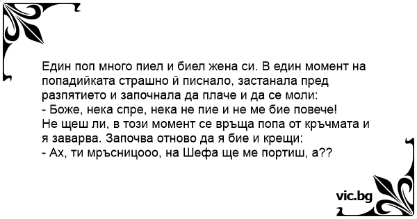 Един поп много пиел и биел жена си. В един момент на попадийката страшно й писнало, застанала пред разпятието и започнала да плаче и да се моли: