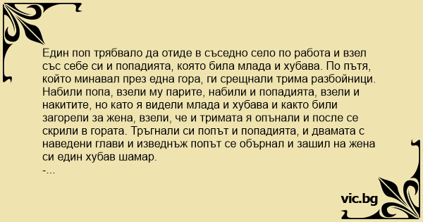 Набили попа, взели му парите, набили и попадията, взели и накитите, но като я видели млада и хубава и както били загорели за жена, взели, че и тримата я опънали и после се скрили в гората. Тръгнали си попът и попадията, и двамата с наведени глави и изведнъж попът се обърнал и зашил на жена си един хубав шамар.