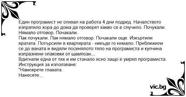 Пак почукали. Пак нямало отговор. Почакали още. Изкъртили вратата. Потърсили в квартирата - никъде го нямало. Приближили се до ваната и видяли посинялото тяло на програмиста и купчина изпразнени опаковки от шампоан...