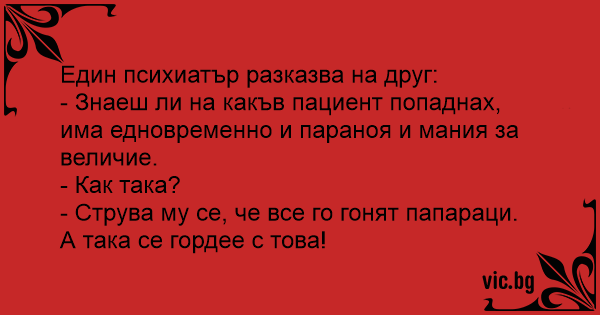 - Знаеш ли на какъв пациент попаднах, има едновременно и параноя и мания за величие.