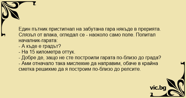 Слязъл от влака, огледал се - наоколо само поле. Попитал началник-гарата: