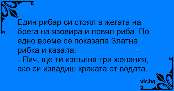 - Пич, ще ти изпълня три желания, ако си извадиш краката от водата...