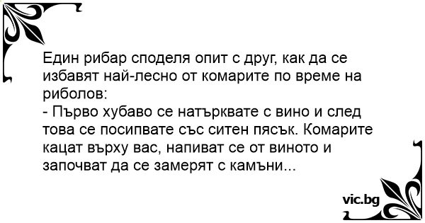 Един рибар споделя опит с друг, как да се избавят най-лесно от комарите по време на риболов: