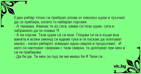 - А не горски. Тези щуки са си мои. Гледам си ги в къщи във ваната и всеки уикенд си идвам тука и ги пускам да поплуват малко - казал рибарят, извадил една cbиpka и продължил - И като се наплуват свирвам с тази cbиpka, те доплуват при мен и си ги прибирам.