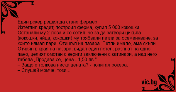 Изтеглил кредит, построил ферма, купил 5 000 кокошки. Останали му 2 лева и се сетил, че за да затвори цикъла (кокошки, яйца, кокошки) му трябвали петли за осеменяване, за които нямал пари. Отишъл на пазара. Петли имало, ама скъпи. Отчаян в края на пазара, видял един петел, разпнат на едно пано, целият омотан с вериги заключени с катинари, а над него табела „Продава се, цена - 1,50 лв."