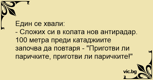 - Сложих си в колата нов антирадар. 100 метра преди катаджиите започва да повтаря - "Приготви ли паричките, приготви ли паричките!"