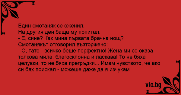 - О, тате - всичко беше перфектно! Жена ми се оказа толкова мила, благосклонна и ласкава! То не бяха целувки, то не бяха прегръдки... Имам чувството, че ако си бях поискал - можеше даже да я изчукам